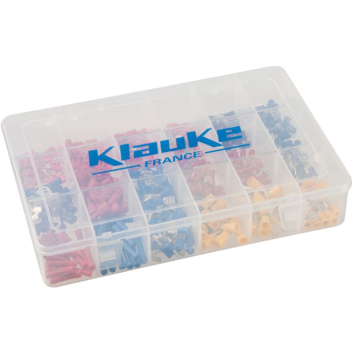 Compositions : - 30 cosses anneau 1,5 - M4, 1,5 - M5 - 30 cosses fourche 1,5 - C4 - 25 cosses anneau 1,5 - M6, 2,5 - M4, 2,5 - M5, 2,5 - M6 - 25 fiches plates femelles totalement isolées 6,35 x 1,5 - 25 fiches plates femelles 6,35 x 2,5, 2,8 x 1,5 - 25 fiches plates mâles 6,35 x 1,5 - 20 cosses fourche 2,5 - C5 - 20 manchons à butées 1,5 et 2,5 - 20 fiches plates femelles avec dérivation 6,35 x 2,5 - 15 cosses anneau 6 - M6, 6 - M8 - 15 fiches plates femelles 6,35 x 6.