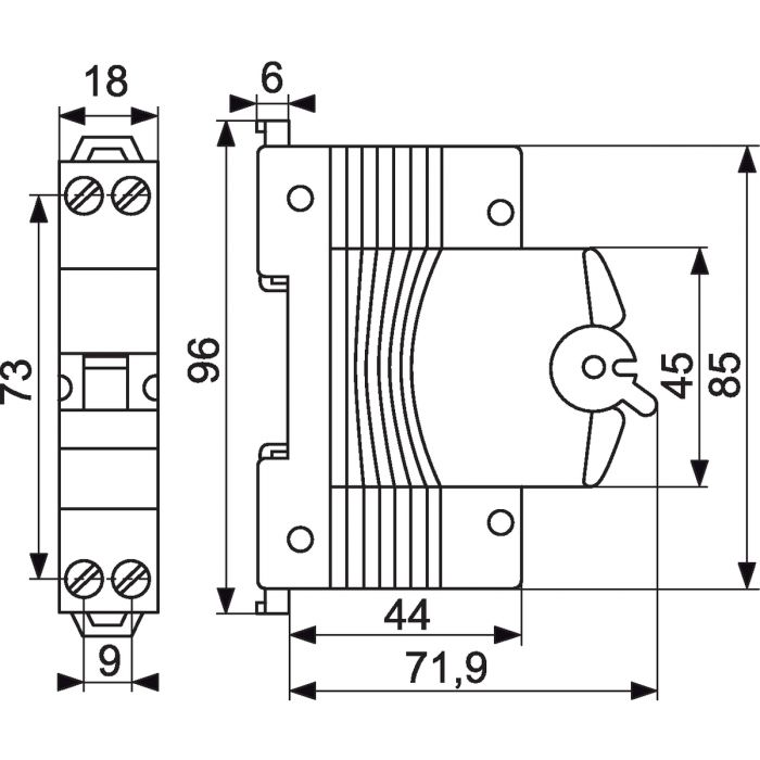 1 module. Disjoncteurs modulaires de protection des circuits. Norme NF EN 60898. 4500A - 6kA / 230Vca.